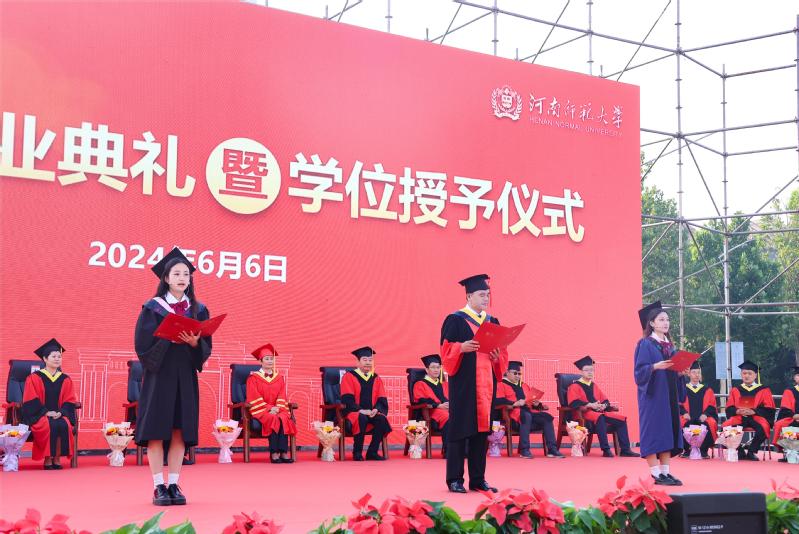 少年当有凌云志,万里长空竞风流。本科毕业生代表、法学院刘怡彤,硕士毕业生代表、马克思主义学院刘佳,博士毕业生代表、环境学院卫涛,以集体朗诵的方式代表毕业生发言,诚挚表达了对师长的感恩和对母校的不舍,并将牢记“厚德博学、止于至善”的校训,厚植家国情怀,涵养进取品格,以奋斗姿态激扬青春,不负时代、不负韶华。