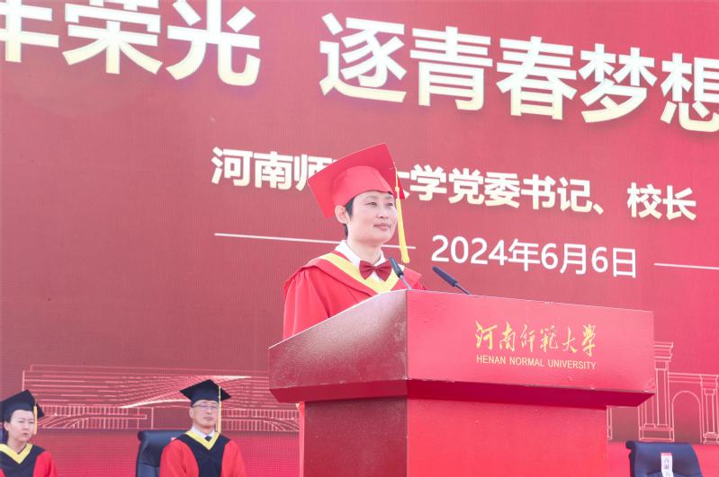 承百年荣光,逐青春梦想,扬帆再启航。校党委书记、校长冯淑霞以此为题,向2024届毕业生送上诚挚的祝福。她为同学们圆满完成学业致以热烈的祝贺,向辛勤培育同学们的老师和家长表示衷心的感谢。青年与时代同频共振。同学们亲历了建党100周年、建团100周年,党的二十大胜利召开等重大历史时刻,在两个百年历史交汇期,留下了“请党放心、强国有我”的铿锵誓言,与国家一起经历了世纪疫情的历史大考,与学校同舟共济抵抗了百年一遇的暴雨洪水,展现了青春的坚毅和勇敢,书写了新时代师大人的责任与担当。临别之际,她勉励同学们,一要保持自信,志存高远,勇担重任。以坚定的信心,立鸿鹄之志,勇敢肩负起国家富强、民族振兴的历史重任,到祖国和人民最需要的地方绽放青春光彩。二要勇于奋斗、追求卓越、不负时代。永葆师大人“厚德博学”上下求索的奋进姿态、“止于至善”追求卓越的执着精神,把个人融入大局,把工作干成事业,把职责当作使命,在平凡的岗位上创造不平凡的业绩,奏响新时代的最强音。三要心怀感恩、脚踏实地、行稳致远。不论顺境或逆境、成功或失败,始终心怀感恩之心,脚踏实地、筑牢根基,“穷则独善其身,达则兼济天下”,在岁月的磨砺中稳步前行。