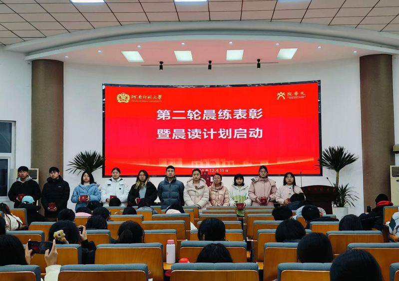 12月11日清晨7时,文学院2024级第二轮晨练表彰暨晨读计划启动仪式在文学院报告厅如期开展。此次活动由2024级辅导员冯家欣老师和李宏一老师共同主持,2024级同学齐聚于此,共同参与这一具有特殊意义的活动。