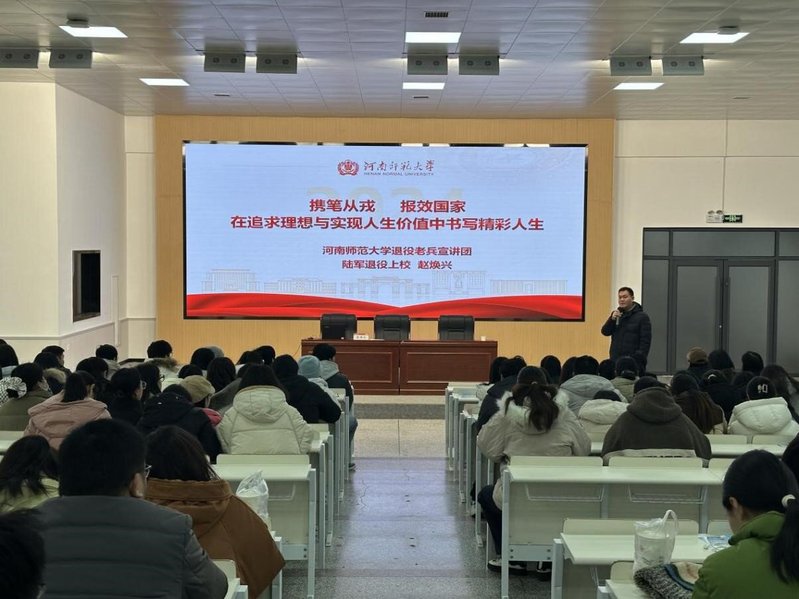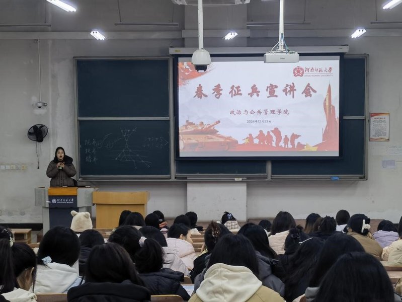 鲜衣怒马朝阳日,从军报国正当时。为激发大学生参军报国热情,帮助大学生了解、掌握应征入伍相关政策和流程,近日,马克思主义学院在思政平台开展2025年春季征兵宣讲会,会议由征兵工作专员郭豪栋老师主持,学院退伍大学生宣讲,全体2025届毕业生参加。