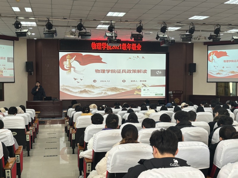 为激发学生参军热情,增强国防意识,12月23日,物理学院于物理北楼报告厅开展征兵宣讲会。学院团委副书记、毕业班辅导员熊子瑞、征兵专员张德凯、优秀退役大学生士兵代表薛深键、朱永晗以及全体2025届毕业生参加此次宣讲会。