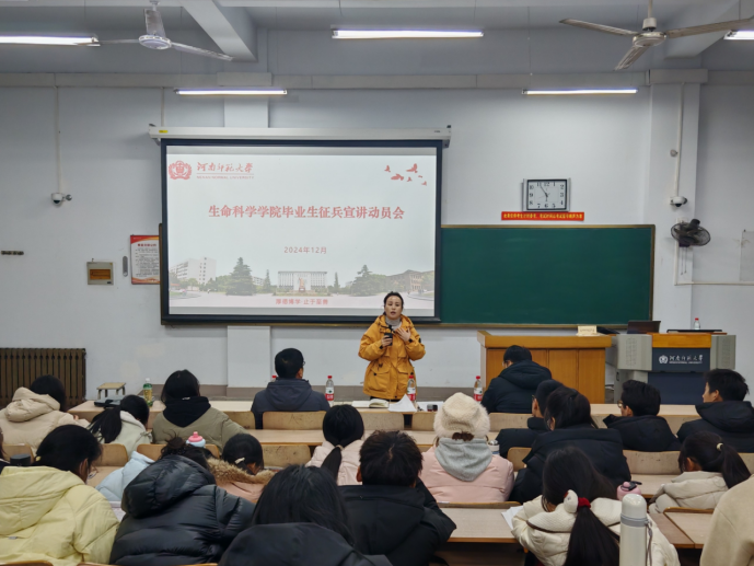 为积极响应国家号召,全面贯彻习近平强军思想,充分激发生科学子的参军入伍热情,12月23日,生命科学学院在新554楼103教室召开2025年春季征兵宣讲动员会。党委学工部、人民武装部国防动员中心主任王姗姗、生命科学学院党委副书记朱进、各年级辅导员、退伍复学优秀学生代表、2021级全体毕业班同学及各年级学生代表参加本次会议,会议由辅导员王云杰主持。