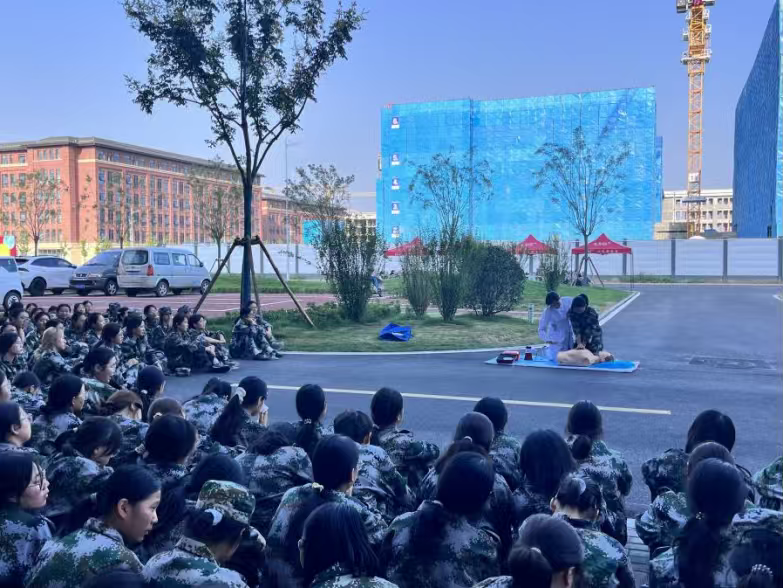 培训现场,全体新生认真专注,围绕在医护人员周围组成多个学习小组。医护人员通过人体模型演示了心肺复苏的完整流程:从现场环境评估、意识和呼吸判断,到胸外按压的正确定位、按压深度与频率,再到开放气道和实施人工呼吸的规范动作。每一个细节都关乎生命存续,深深吸引了在场的每一位同学。