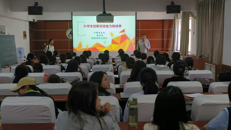为深入贯彻国家创新驱动发展战略,在校生更快融入创新创业领域、清晰认知双创发展路径,外国语学院于2025年9月30日在外语楼A204举办大学生创新创业能力培养专题讲座。本次讲座由2023级辅导员彭典范主讲,吸引了全院100余名同学积极参与。