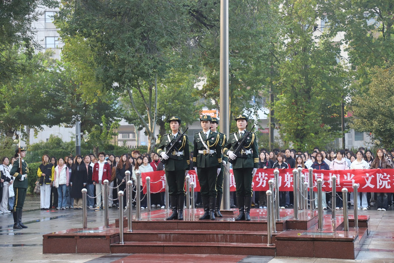 10月13日上午,文学院在勤政楼前举行升旗仪式。文学院党委书记孙昌松、党委学工部副部长赵焕兴、学院党委副书记张颜勇、各年级专兼职辅导员与2024级全体本科生参加本次活动。