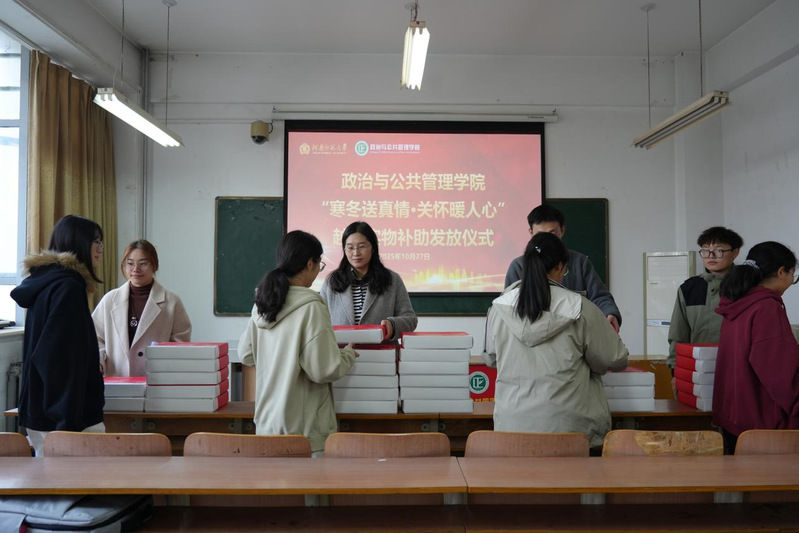 寒潮将至,温情先行。为切实帮助家庭经济困难学生温暖过冬,10月27日中午,政治与公共管理学院在崇德楼217室举行“寒冬送真情,关怀暖人心”学生越冬实物补助发放仪式。学院党委副书记张瑾出席活动,2025级专兼职辅导员张永欣、胡佳文及全体受助学生共同参与。仪式由张永欣主持。
