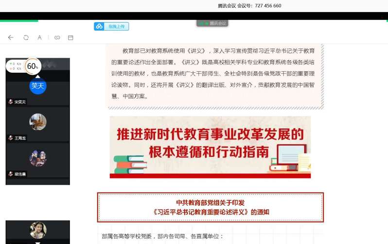 为深入学习习近平总书记关于教育的重要论述,不断提升思想政治素质,7月19日,软件学院2019级通过腾讯会议、钉钉等网络平台开展“习近平总书记关于教育的重要论述”线上学习会。辅导员张清宇主持会议,2019级全体学生参与其中。