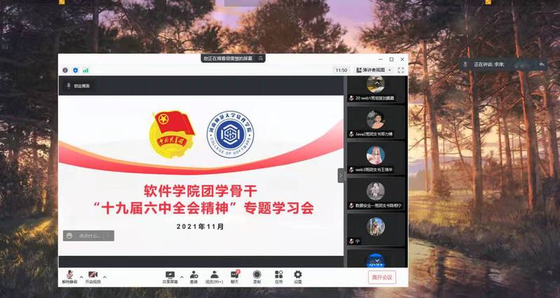 为学习宣传贯彻党的十九届六中全会精神,增强团员青年建功新时代及爱党爱国热情。11月15日晚,软件学院以线上形式组织学院团学骨干学习党的十九届六中全会精神,学院团委副书记李淳担任主讲,学院团学骨干200余人参加会议。