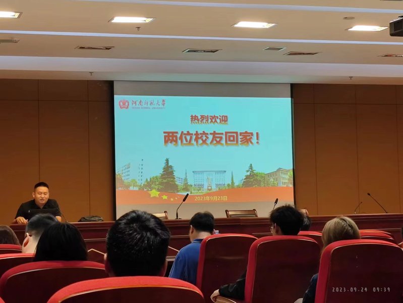 两位校友首先表达了自己对母校、对恩师的深切情怀,祝贺母校风雨兼程迎来了百年华诞。2009级校友徐文涛现就职于国家超级计算深圳中心,参与世界运行速度最快的超级计算机的研制和应用管理工作,他结合自身和身边其他校友的学习、工作经历,鼓励同学们要以学业为重,利用在校时间多参与与专业相关的竞赛,以赛促学,提升自身的综合能力,同时介绍了考研、保研以及公务员考试的一些经验和看法,从就业形势上分析了软件专业的前景,给同学们指明了学习的方向。2014级校友王詹杰,河南智泉研学教育咨询有限公司总经理,深情回忆了在母校学习的美好时光,在母校读书期间自己最大的收获就是师生情。师大淳厚的校训和老师的谆谆教导使得他在创业成功之后不忘回报母校。看到母校各项事业发展蒸蒸日上,为母校祝福的同时也尽自己一份绵薄之力助力母校发展,积极与母校搭建平台,为学弟学妹们提供更优质的教育资源。