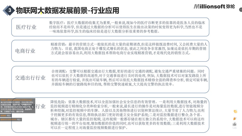会上,任恒宇就弥纶的创新业务发展进行了详细介绍,包括智慧交通方面,行业领先的车联网监管云平台、基于物联网技术的智慧车联网大数据云平台;智慧园区方面,智慧社区、智慧楼宇,以及智慧高速国家试点项目等。同时对物联网大数据行业应用、发展前景进行了分析,包括医疗行业、电商行业、交通出行、安保行业等。让同学们更加了解物联网技术,体会物联网技术的深远影响。
