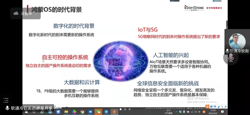 为贯彻国家信息化建设,产教融合发展战略,衔接第一课堂和第二课堂,将线上和线下教学相融合,让学生充分了解行业需求,认知专业方向和就业趋势,软件学院开展“博约企业讲堂系列”线上活动。4月2日下午进行了第二场线上讲座——“数字化时代-鸿蒙生态行业介绍”。由软通动力信息技术(股份)有限公司首席架构师冷钦街担任主讲,软件学院相关负责教师、软件学院2020级、2021级全体学生聆听了讲座,讲座由软件学院实习实训办公室主任刘金金主持。