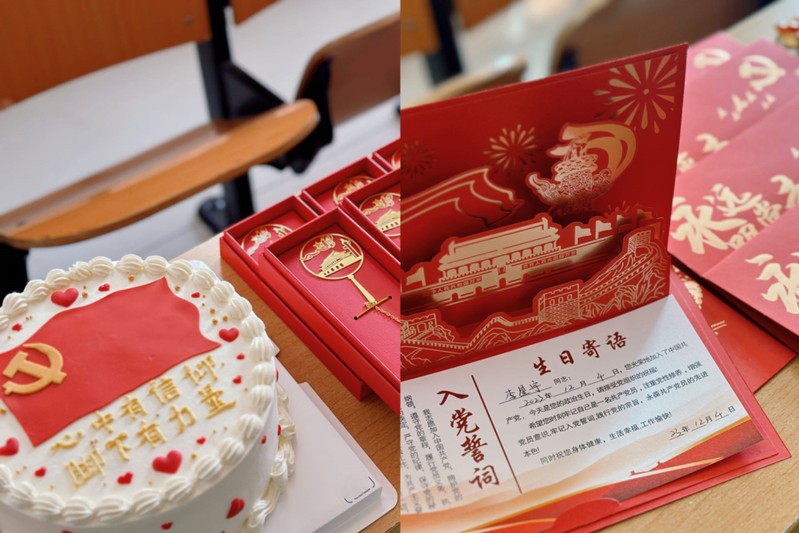 活动在庄严的国歌声中拉开序幕。首先,由宣传委员李冠沛宣读过政治生日的党员同志名单,依次赠送“政治生日”贺卡和纪念礼物。大家集体观看了《中国共产党历程回顾》,从党的发展历史中感受共产党员的纯洁性和先进性。随后,支部书记高睿婧为新进党员同志佩戴党员徽章,并带领大家重温入党誓词。面对鲜红的党旗,全体党员同志共同高举右拳,铿锵有力的宣誓,表达了大家对党的忠诚与热爱和听党话、跟党走的坚定决心。高睿婧为青年党员送上生日寄语,勉励大家时刻谨记学思想、强党性,牢记政治身份和初心使命,充分发挥先锋模范带头作用。最后,大家一起分享政治生日蛋糕。充满仪式感的“政治生日”,让党员们感受到来自党组织的温暖关怀,学生党员李彬源满怀喜悦之情激动地说:“今天是我的第一个‘政治生日’,我一定牢记初心使命,用青春热血书写对祖国、对人民的热爱!”