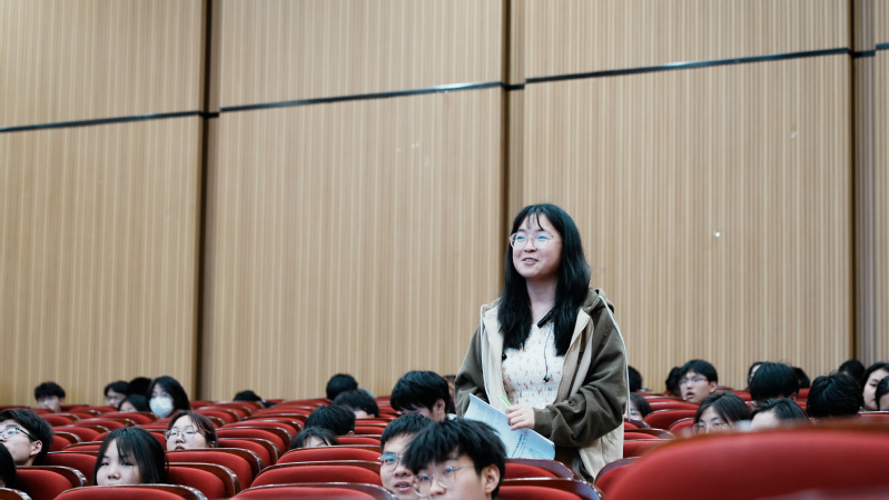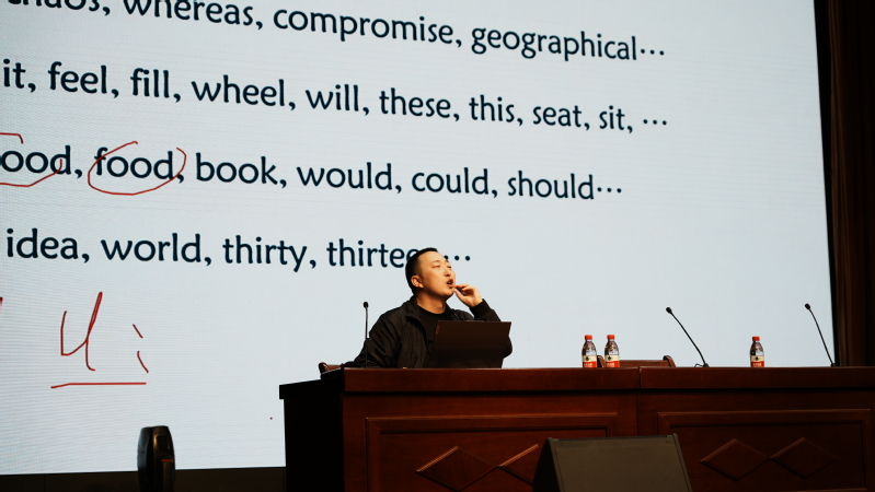 讲座伊始,薛非以英语基础薄弱同学的痛点——单词作为切入点,用幽默风趣的单词“发音诊断”迅速吸引同学们的注意力,激发起学生学习本次英语课程的热情;接着从文字基础、听口基础以及审题技巧等方面讲述如何读准英语、快速做题,“纠音与跟读结合,精听与技巧并进”,精彩绝伦的讲述引得台下掌声不断;随后,薛非梳理分析四级写作中的常见问题,鼓励同学们把握核心、紧抓要点,将“听说读写”落实到日常训练中,日积月累,厚积薄发。最后,在互动答疑环节中,同学们争先提问,虚心请教,现场学习氛围十分活跃。