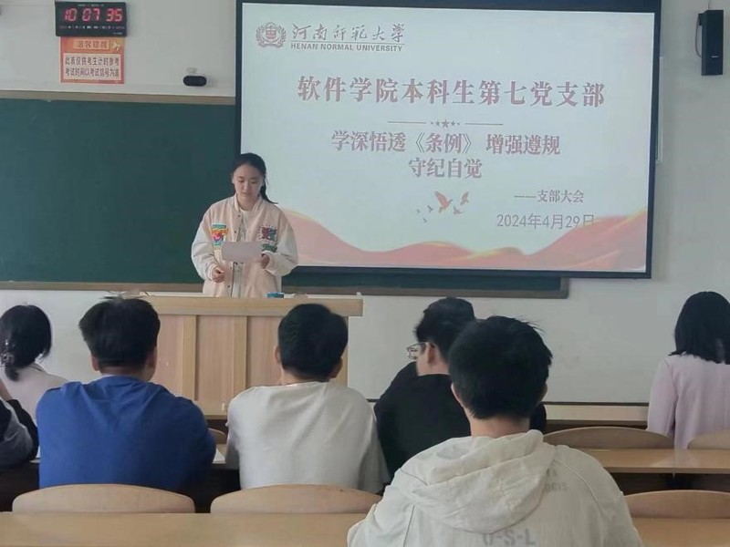 2024年4月29日,软件学院本科生第七党支部在向真楼318会议室举行了《中国共产党纪律处分条例》学习会议。本次会议由支部书记刘冬冬主持,支部全体党员参加,旨在加强党员纪律意识,提升党性修养。