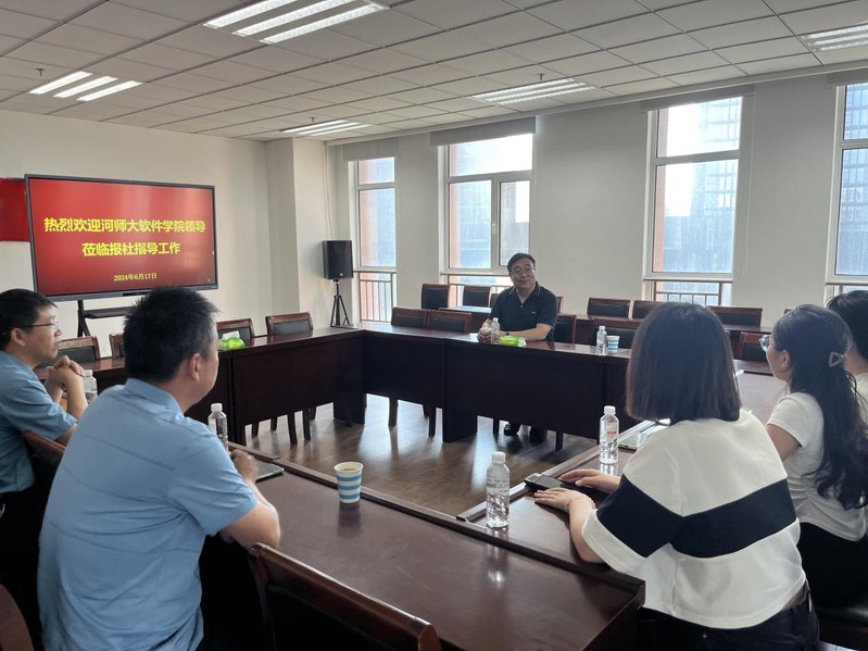 中学生学习报社社长、总编辑、师大优秀校友李开振对马新峰书记一行的到来表示热烈欢迎。随后,他简要介绍了报社8名实习生的实习情况,并对软件学院实习生的工作态度和专业能力给予充分肯定。希望今后与软件学院就实习生输送建立长效机制,同时对实习生提出三点要求:一、这是一个伟大的时代,发展平台广,就业机会多,希望同学们都能尽快找准定位、实现理想;二、当今社会科技发展迅猛、竞争日趋激烈,人工智能技术已经并将继续深刻改变社会生产、生活方式,对传统行业必将带来前所未有的冲击,影响巨大而深远,希望同学们运用专业特长,打造自己人生的“护城河”、发展的“助推器”;三、未来社会各行业入职门槛不断提高,同学们要珍惜机会,抓住机遇,既要仰望星空,又要脚踏实地,不断提升能力和本领,为实现中国梦贡献自己的青春与智慧。