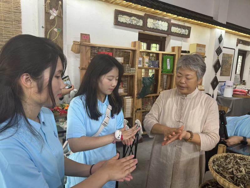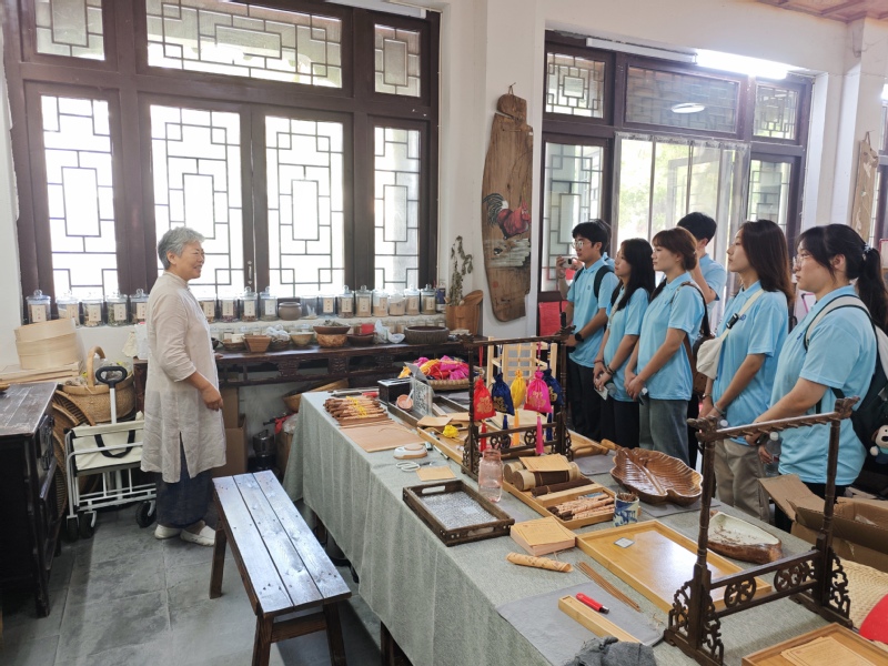 随后,一行人前往了曜艾堂,这里汇聚了罗氏传统制艾技艺的精髓。在传承人的介绍下,同学们不仅了解了艾草的种植、采摘、加工等全过程,还见证了传统技艺与现代科技相结合的创新产品,如香露、香珠、香锤等,这些产品既保留了传统艾文化的精髓,又融入了现代审美与实用功能,令人耳目一新。