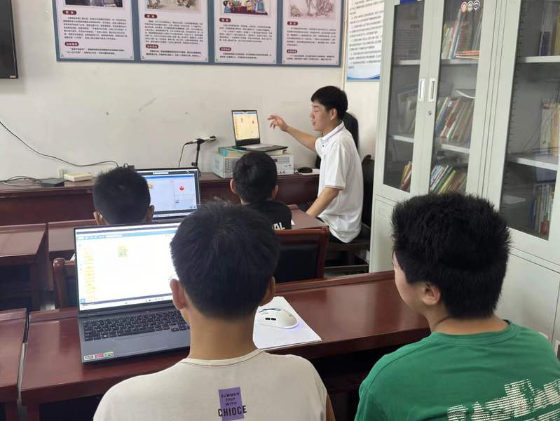 活动期间,实践团队成员们精心准备的计算机基础课程成为一大亮点,特别是关于Scratch编程和游戏开发的讲解,深受孩子们的喜爱。在课堂上,实践团队成员王迎用生动有趣的方式向孩子们介绍了Scratch编程的基本概念和操作方法。通过简单易懂的案例和互动环节,孩子们逐渐掌握了编程的逻辑思维,然后在助教老师的帮助下能够自己动手创作一些简单的程序。