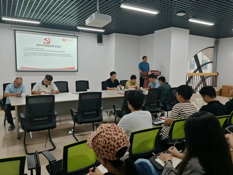 9月11日下午,软件学院在实训楼413会议室召开教职工理论学习会议,学院领导班子和全体教职工参加。会议由学院党委书记马新峰主持。