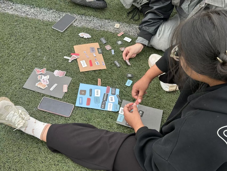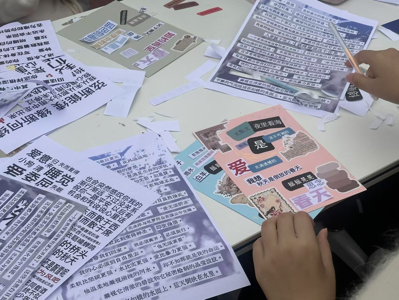 活动伊始,活动组织人员给大家讲解了拼贴诗的制作流程,并殷切希望各位同学都能够充分发挥自己的想象,尽情挥墨,积极创作。随后,同学们纷纷开始创作,活动现场的氛围热烈而富有诗意。桌上摆放着各类纸条、贴纸与画笔,它们宛如一座创作的宝库等待着参与者们探索。同学们在文字的海洋中寻宝,精心挑选一个个词语,然后巧妙地拼贴组合,将内心深处的情感与思考转化为一首首独一无二的拼贴诗。在这个过程中,他们与自己对话,从碎片化的词语中找寻那些被忽略的自我碎片。一位参与者兴奋地表示:“这次活动太奇妙了!平常看似普通的字词,在这里竟焕发出新的生机,拼贴的过程让我更加了解自己的内心世界。”