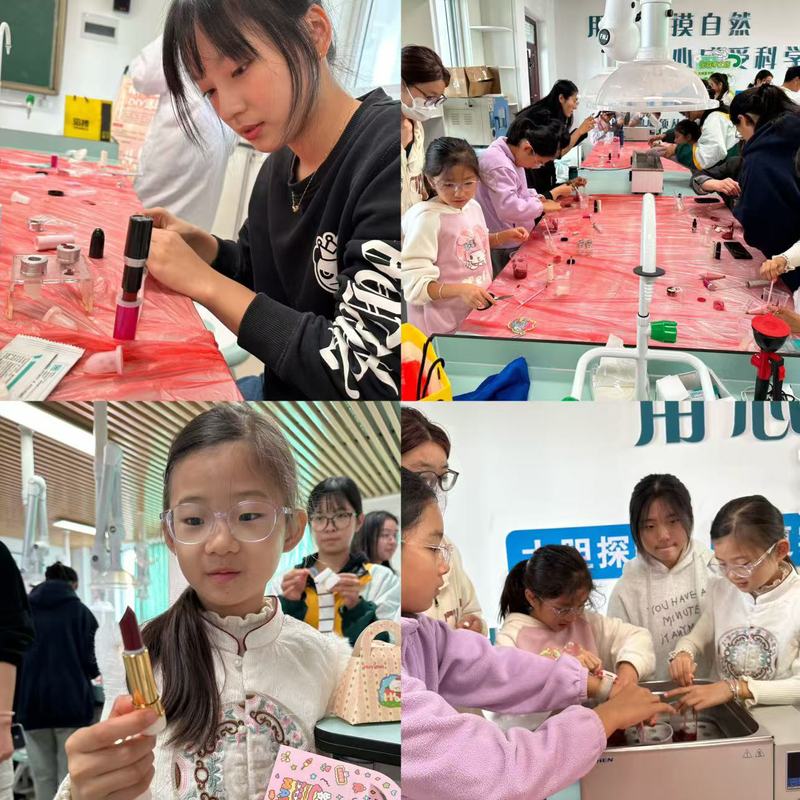 活动现场气氛热烈,一来到化学实验室,大、小学生们便被各种实验仪器深深吸引。在工作人员讲述本次口红制作实验的流程和注意事项之后,同学们开始挑选自己喜欢的色粉,将其与植物油、白蜡、香精等原料混合均匀,大学生帮助小朋友将原料放在恒温水浴锅中进行搅拌、融化,倒入模具冷藏一段时间过后,迎来了最激动人心的脱模工序。同学们屏息凝神、小心翼翼地将膏体与模具进行分离,在大家的共同努力下,一支支独一无二、饱含着辛勤劳动成果的口红终于制作完成。同学们纷纷表示“在本次口红制作活动中既感受到了化学实验的乐趣,同时也体会到了化学与生活有着密不可分的关系。”活动最后,学生们欢欣雀跃,自豪地拿着亲手制作的口红进行合影留念。