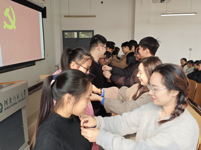 活动在庄严的《国际歌》声中拉开序幕,随后支部书记李娟老师发表致辞。她强调,此次活动不仅是新党员身份转变的重要时刻,也是他们对党承诺承担政治和组织责任的体现。李娟老师鼓励大家坚守初心、牢记使命,为党的事业贡献青春和力量。紧接着,全体党员在党旗下进行了庄严的宣誓仪式,新发展党员代表孙岑同学随后分享了自己的入党初心和未来努力的方向。随后,正式党员为新发展党员佩戴党徽,象征着党组织对新成员的接纳和期许。