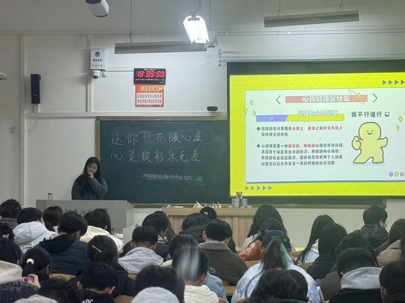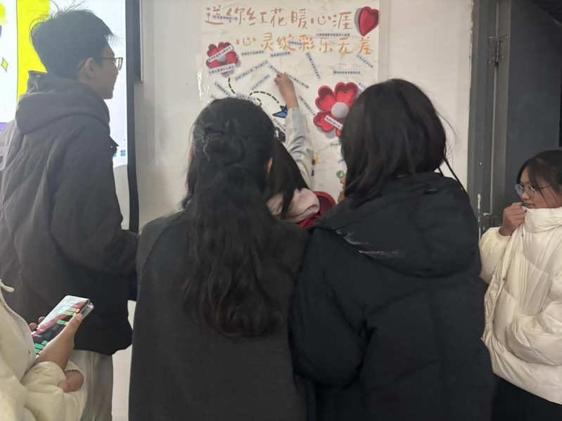 活动伊始,教室门口设置了特别环节,同学们纷纷撕掉贴有定义性标签的纸张,寓意着挣脱过往束缚,以全新姿态投入生活。紧接着,大家在红花纸上认真书写具有积极情绪价值的心灵寄语,讲述温暖与美好,并将其投入精美箱子中。每位参与活动的同学从箱子中随机抽取小红花,与喜爱的小红花合影留念并发布朋友圈,现场其乐融融。随后,“幸福刮刮乐”游戏欢乐开场,同学们满怀期待地刮开卡片,积极参与心理知识问答,问答涉及自我认识、情绪疏解、压力调适、人际沟通等各个方面,同学们通过知识问答进一步学习了心理健康知识;抽到才艺表演的同学更是毫不怯场,唱歌、朗诵等精彩节目轮番上演,赢得阵阵掌声。“同甘共苦”游戏则将活动推向了高潮,参与者随机抽取纸条,与团队成员携手完成活动任务,在大家共同合作努力的过程中,彼此间的信任与了解也得到进一步加深。层层递进的活动环节,丰富了大家的自我保健心理知识和技巧。活动尾声,每位同学都收到了一支小红花棒棒糖,甜蜜的滋味在口中散开,同时收获惊喜与感动。