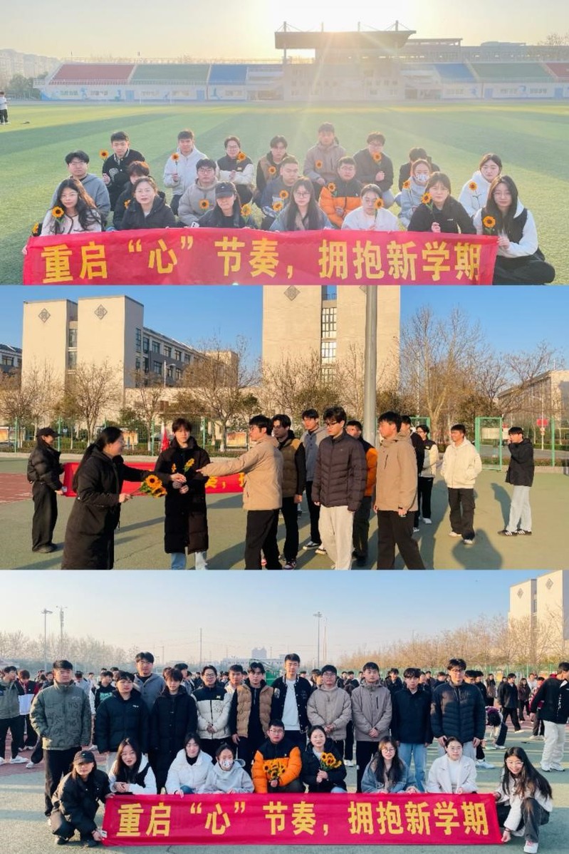 清晨,伴随着和煦的阳光,师生们齐聚操场,共同开启运动之旅。活动伊始,一场别开生面的团体慢跑和多人跳绳比赛点燃了现场气氛。同学们在运动中挥洒汗水,释放压力,尽情展现青春活力。运动过后,大家集体躺卧在草地上,仰望蓝天白云,感受微风拂面,在自然中舒缓身心,体验集体带来的温暖与力量。活动现场还特别设置了“心灵驿站”打卡点,同学们手持“重启‘心’节奏,拥抱新学期”的心理健康标语合影留念,定格美好瞬间。为鼓励同学们关注心理健康,积极参与活动,学院还为每位参与者准备了向日葵花束,寓意着阳光、希望和积极向上的生活态度。