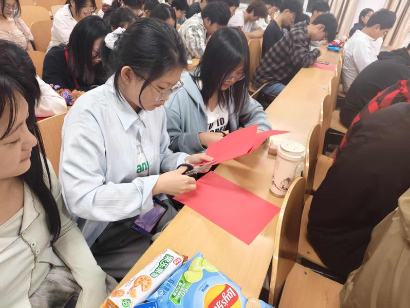 活动开始,班委为同学们科普国家安全知识,强调维护国家安全的重要性,引导大家树立责任意识。随后,精彩环节相继开展。“猜红歌” 时,经典红歌前奏响起,同学们抢答踊跃,不仅能准确说出《黄河大合唱》《没有共产党就没有新中国》等歌名,还分享歌曲背后革命故事,重温先辈奋斗历程;“你说我猜” 环节围绕红色历史事件、英雄人物和经典影视作品出题,小组代表生动描述,组员默契配合,在欢乐中加深对红色知识的理解;“红色剪纸” 环节最具创意,同学们以剪刀作笔、红纸为墨,或独自创作,或协作完成,将党旗、红船、五星等红色元素融入作品,用传统艺术诠释红色文化。