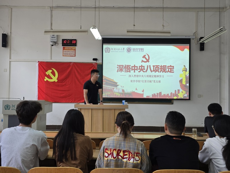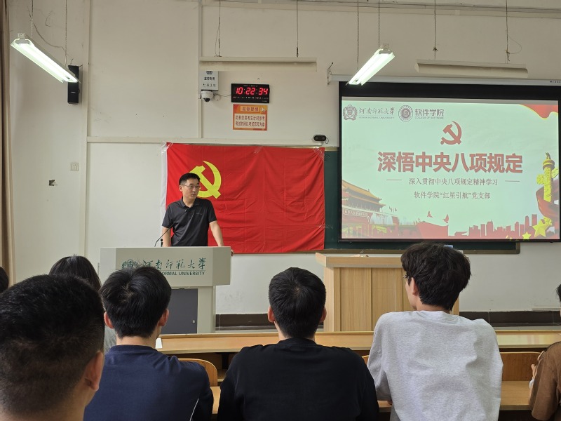 为深入贯彻落实全面从严治党要求,进一步加强党风廉政建设教育,5月22日上午,软件学院“红星引航”党支部在向真楼108开展了“深悟中央八项规定精神”学习教育主题党日活动。软件学院党委书记寇玉鹏老师、“红星引航”党支部书记22级辅导员王晓祥老师和支部组织委员24级辅导员叶娅老师及支部全体成员积极参与,活动取得圆满成功。