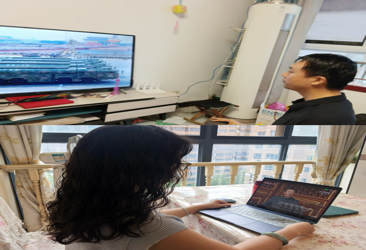 学院党政领导班子成员一早来到实训楼413会议室,等待大会的开始。学院各基层党支部组织师生通过线上同步观看的方式,认真聆听习近平总书记发表的重要讲话,共同见证人民军队的威武雄姿和科技强国强军的伟大成就。