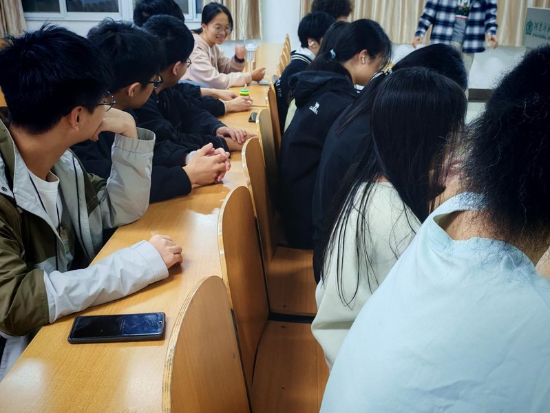 活动以汉诺塔团队接力为核心,赛前各队围坐讨论战术,明确传递顺序与手势暗号。比赛全程禁言,队员按序上前传递道具、移动圆盘:有人精准托举圆盘对位归位,有人用眼神示意队友衔接节奏,全程需严格规避 “大盘压小盘”“违规交流”,用时最短且无违规者获胜。场边同学虽不能出声,却以点头、握拳传递鼓励,现场氛围紧张又富协作活力。