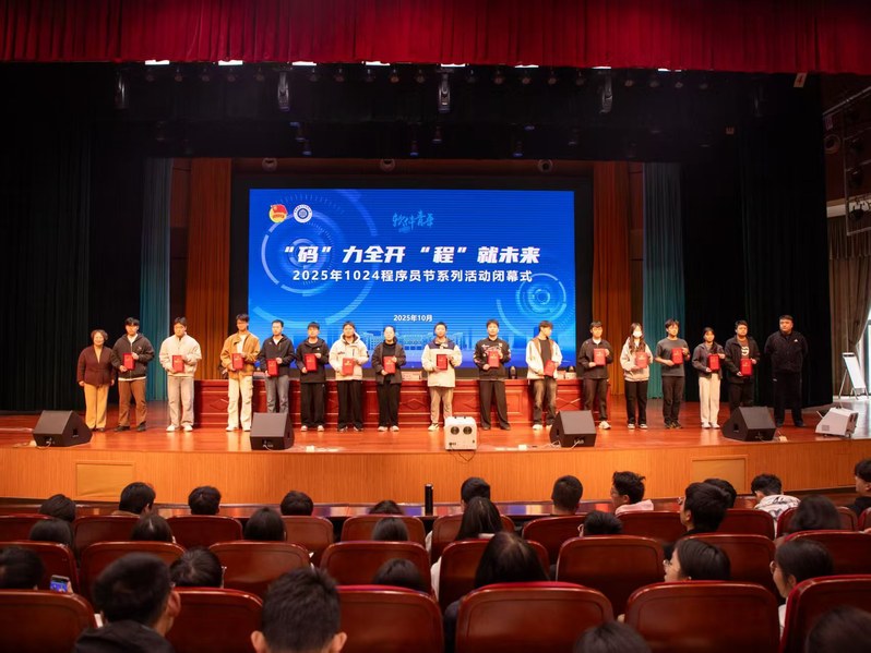 为总结1024程序员节系列活动成果并表彰优秀个人团体,10月24日,软件学院于平原湖校区一号报告厅举办“‘码’力全开,‘程’就未来”1024 程序员节闭幕式,软件学院副院长卢海燕、党委副书记原方和团委书记李淳出席,400余名师生参与。