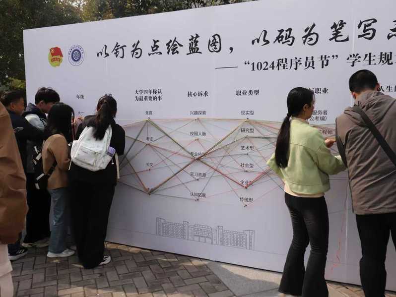 活动现场设置一块大型互动展板,板上标注含大一至大四各年级“起始钉”及考研、考公、就业等目标“方向钉”,软件学院学术创新部工作人员向同学们提供彩色棉线。活动期间,同学们排队领取不同颜色棉线,将其从年级“起始钉”缠至目标“方向钉”,并标注规划关键词。同学们认真规划自己的未来,借活动之机把心中所想以可观可感的形式呈现于板面上,更加坚定了努力的方向。活动现场气氛热烈,参与的同学络绎不绝,五彩棉线编织出一幅凝聚学子梦想的蓝图。活动结束后,现场同学纷纷表示通过此次活动进一步梳理了自己的学习目标和职业理想,对自身发展有了更为清晰的认知。