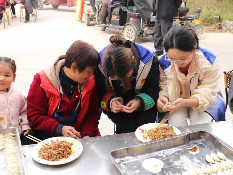 活动伊始,志愿者们集结后乘车抵达活动场地,迅速完成分工并布置好活动现场。“数字助老”环节率先展开:志愿者们一对一陪同老人,耐心指导他们学习解锁手机、使用微信视频通话、线上缴费等智能设备基础操作,不少老人从“不敢碰”到能独立发语音,实现了显著的进步。随后,小杨庄村党委书记王树全开场致辞,志愿者与村民共同呈现了朗诵、舞蹈、小品、戏剧、跆拳道和歌曲等精彩节目,赢得满堂喝彩。展演间隙,饺子宴同步开启,志愿者与老人围坐协作,在包饺子的过程中展开亲切交流,热腾腾的香气里满是邻里的融洽。餐后,志愿者们将打包好的饺子送到行动不便的老人家中,让温暖关怀传递至每一户。最后,志愿者代表朱晓倩总结活动意义,强调敬老爱老是中华民族的传统美德,也是学院育人工作的重要组成部分。