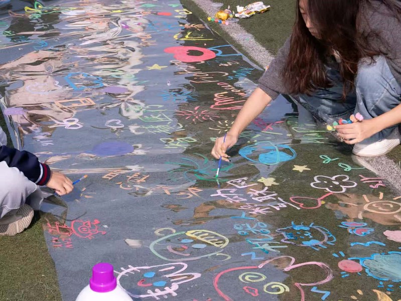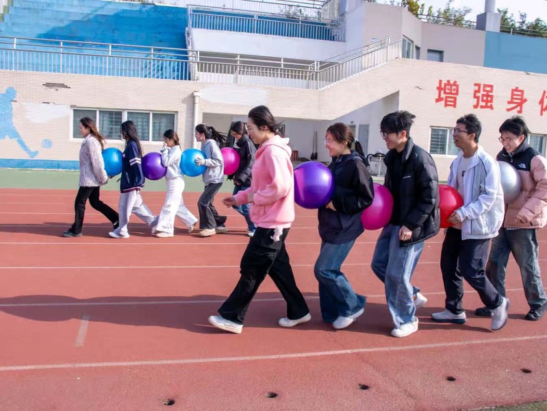 活动现场温馨热烈,三项特色环节依次展开,寓教于乐、润心无声。“膜”法“蜜”语环节中,透明膜拉条前人头攒动。同学们手持彩绘笔,或挥洒创意涂鸦,或书写心情寄语,将青春的感悟与对未来的期许化作跃然膜上的斑斓色彩与真挚文字,分享过程中,压力悄然释放,温暖在笔尖与心间传递。“夹球同行”环节欢声不断、笑语连连,成为促进跨年级融合的重要载体。参与者两人一组,背靠背夹住气球协力前行,既要小心谨慎避免掉落,又要默契配合冲刺终点。在协作与鼓励中,陌生感逐渐消融,朋辈情谊悄然升温。“镂空传情”则巧妙融合自然之美与心灵之悟。同学们手持自制的镂空图案纸板,在冬日暖阳下寻找心仪的风景——透过纸间的空隙,阳光、绿植与笑脸被定格成一幅幅独特画面。在发现美、记录美的过程中,大家真切感受到生活的温度与内心的宁静。