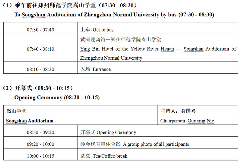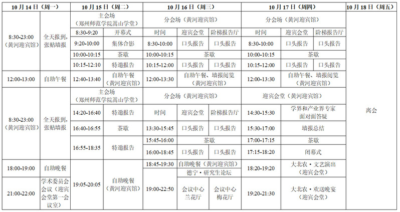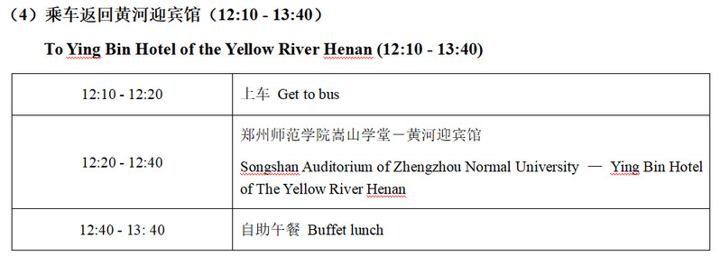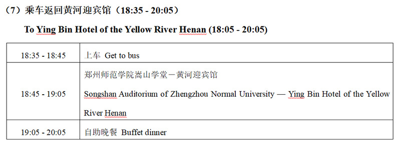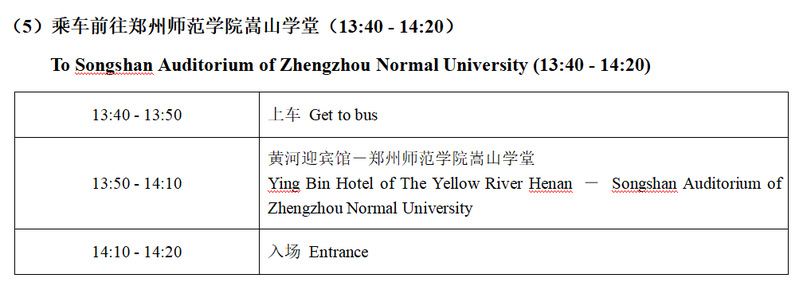 4、会场车辆摆渡:10月15日会议在郑州师范学院嵩山学堂进行。届时,需要乘坐大巴车往返嵩山学堂和黄河迎宾馆。请各位嘉宾在指定时间、乘坐指定的车辆(乘车时间,见本指南7-9页;车辆信息,见资料袋中的参会须知);