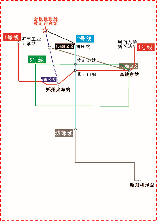 地铁:火车站(西广场)地铁1号线至紫荆山站→转2号线到刘庄站(D2出站口出),步行178米至客运北站公交站,乘坐156路公交车到黄河迎宾馆;或刘庄地铁站出站,乘出租车至黄河迎宾馆(约7公里、20分钟、20元)。