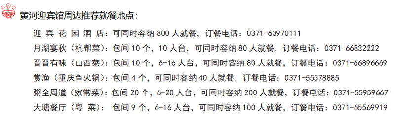 会务组房间 黄河迎宾馆10号楼1125 | 内 线:直拨1125 外 线:(0371)66778888 - 1125 |
