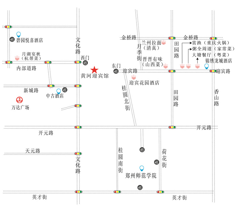 地铁:地铁城郊线至刘庄站(D2出站口),步行178米至客运北站公交站,乘坐156路公交车到黄河迎宾馆;或刘庄地铁站出站,乘出租车至黄河迎宾馆(约7公里、20分钟、20元)。