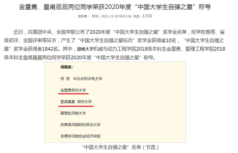 2021年度中国大学生自强之星 ~ 皇甫晨晨、金章勇