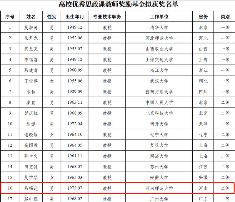 2022全国高等学校优秀思政课教师奖励基金 ~ 马福运