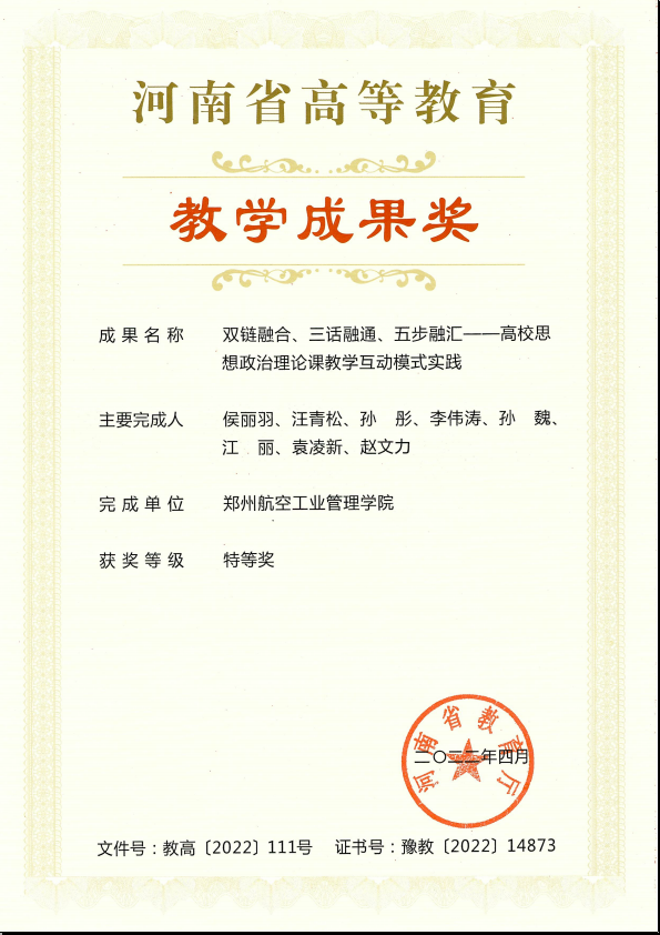 2022年度河南省高等教育教学成果奖特等奖 ~ 侯丽羽