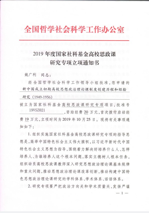 2019年度国家社科基金高校思政课研究专项 ~ 姚广利