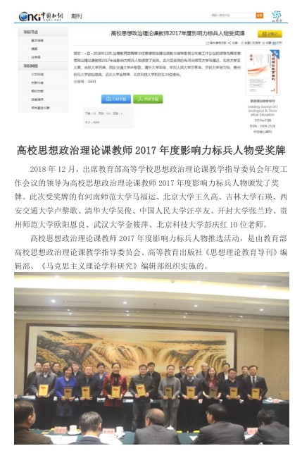【思想理论教育导刊】高校思想政治理论课教师 2017 年度影响力标兵人物受奖牌