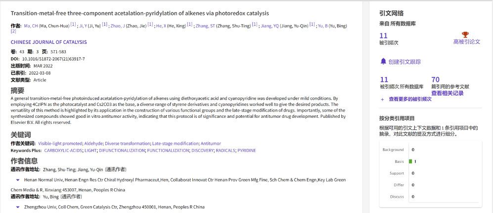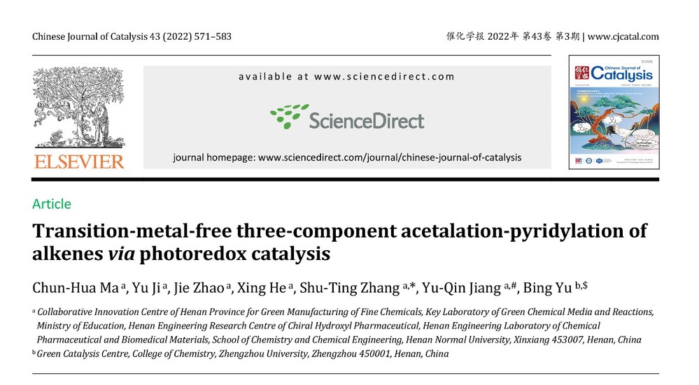 据2022年11月ESI数据库最新数据显示,九三学社社员、伟德官网下载苹果版化学化工学院姜玉钦教授团队于2022年在化学领域国际顶尖期刊Chinese Journal of Catalysis以封面形式发表的SCI一区论文“Transition-metal-free three-component acetalation-pyridylation of alkenes via photoredox catalysis”入选ESI高被引论文。论文第一作者为伟德官网下载苹果版化学化工学院青年教师马春华博士,论文通讯作者为伟德官网下载苹果版张淑婷博士、姜玉钦教授和郑州大学於兵教授,伟德官网下载苹果版为第一署名单位。