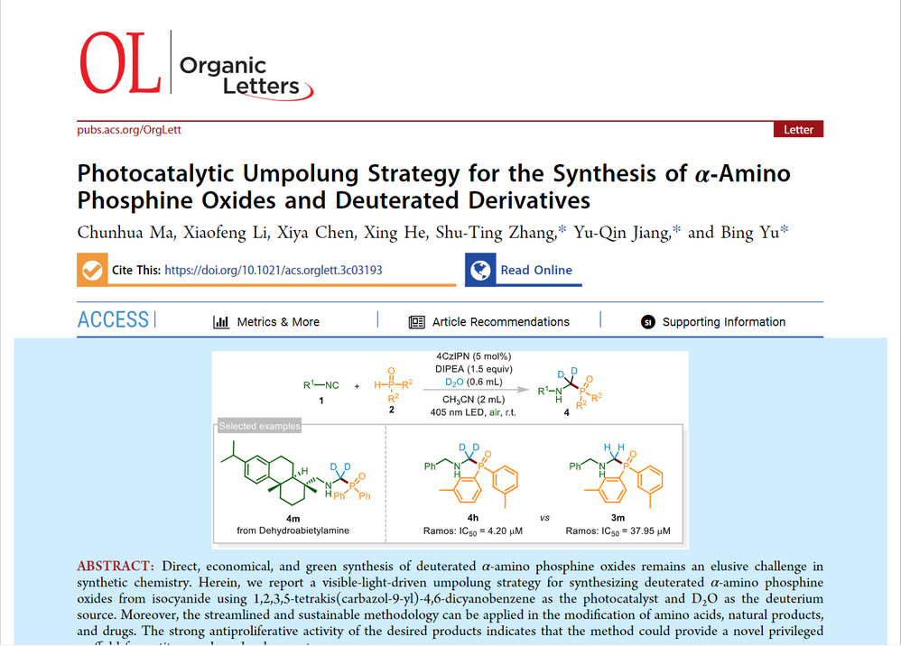 含有N-C(sp3)-P支架的α-氨基膦酸酯/膦氧化物在药物开发中有着广泛的应用。尽管在构建α-氨基膦酸酯/膦氧化物方面取得了显著进展,氘代α-氨基膦酰类化合物的合成仍然未知。自2017年氘代丁苯那嗪获得 FDA批准以来,氘代药物技术(DDT)因其可以延长药物的半衰期,减少有毒代谢产物的产生而备受关注。因此,开发新的高效策略来精确合成含氘有机分子具有非常重要的意义。在可见光催化下,我中心的药物研究与开发创新团队使用氧膦化物对异氰进行自由基加成,随后采用水/氘代水进行还原加H/D,实现了N-C(sp3)-P 和相应氘代产物的快速构建。