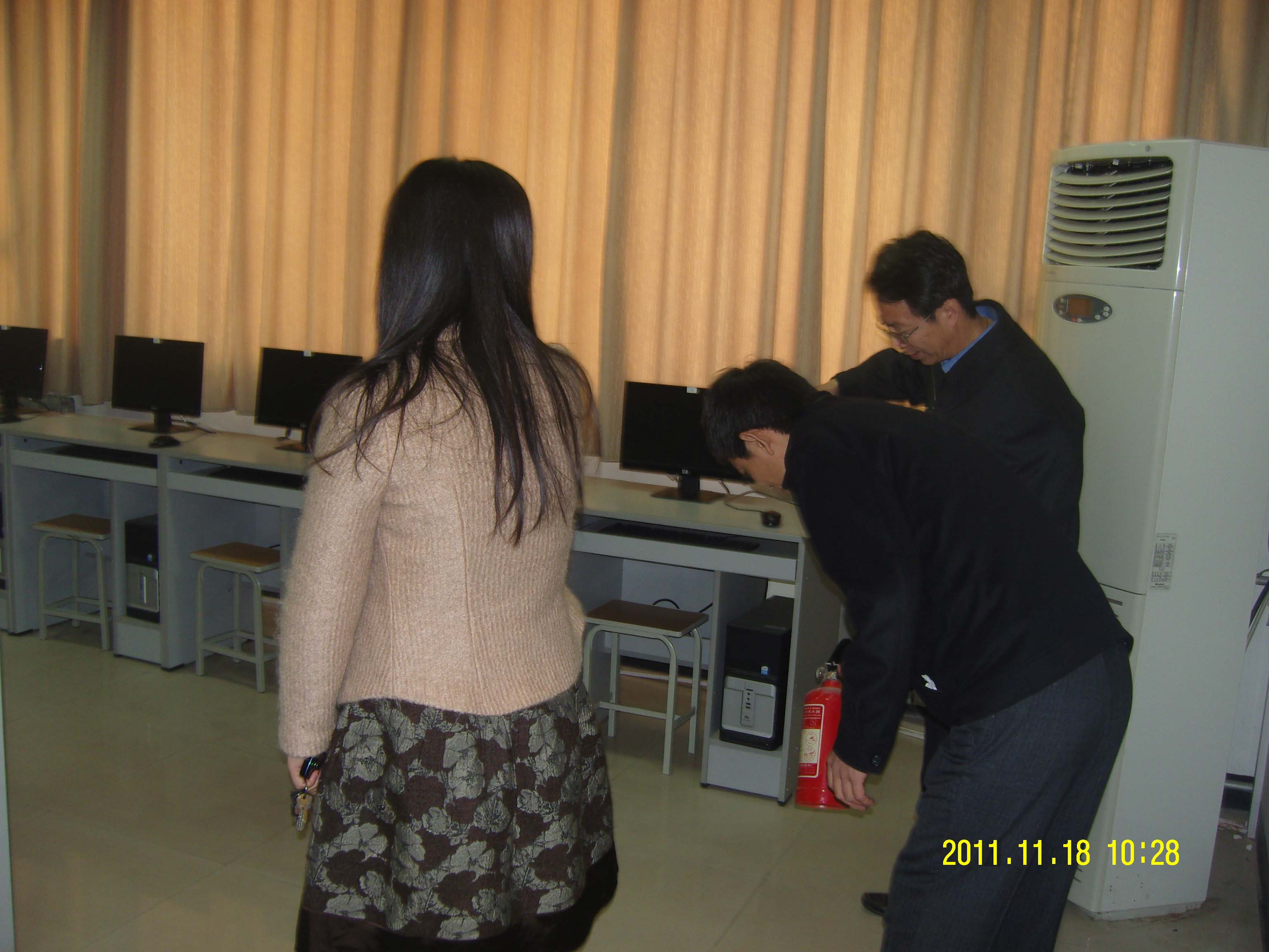 (图二)领导小组认真查看实验教学示范中心灭火器是否过期