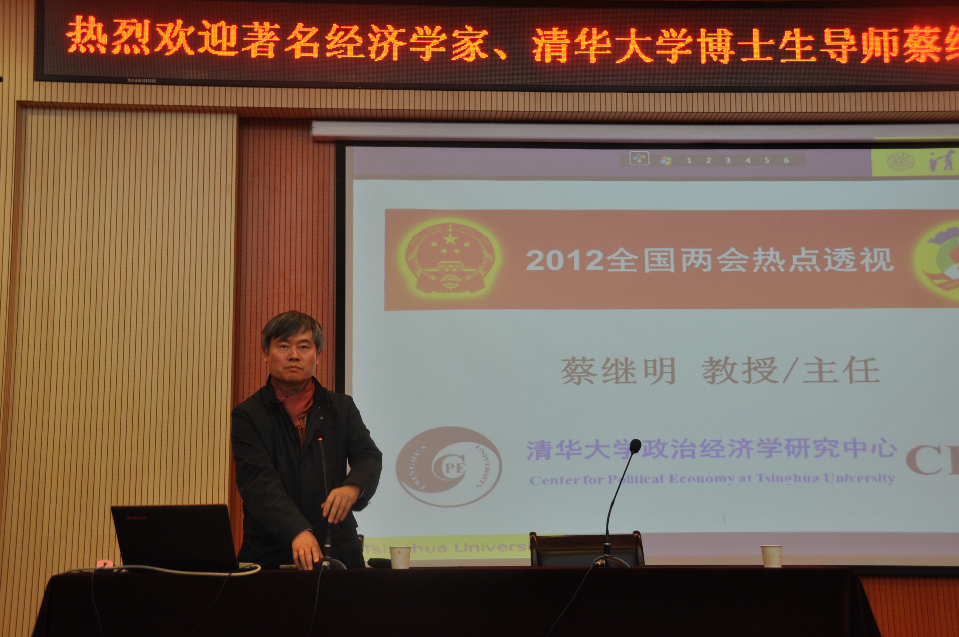 首先,蔡教授对“2012年政府工作报告”进行了深入解读,并对国内生产总值与公共财产收入百分比增长问题进行了详细分析,同时结合大学生就业和农民工人文关怀等热点话题作深刻探讨。然后,蔡教授就“2012年经济增长任务”问题展开精彩论述。他指出要千方百计扩大就业,深化农村改革,积极稳妥推进城镇化,同时要继续搞好房地产市场调控和保障性安居工程建设。他认为,坚持优先发展教育“非不能也,实不为也”,并提出“鼓励文化旅游,落实带薪休假”的鲜明观点,结合自己作为政协委员在今年两会期间所做的关于“完善惠农强农富农政策 确保国家粮食安全”主题发言的切身经历进行了详细的阐释,他指出:“三农”问题实质是农民的国民待遇问题,根本问题是土地问题,解决的根本途径是加快城市化进程,解决“三农”问题应坚持城乡统筹的科学发展。并针对当前的政治体制改革、所有制结构、收入分配、国有垄断企业改革等热点问题进行了深入浅出地剖析。