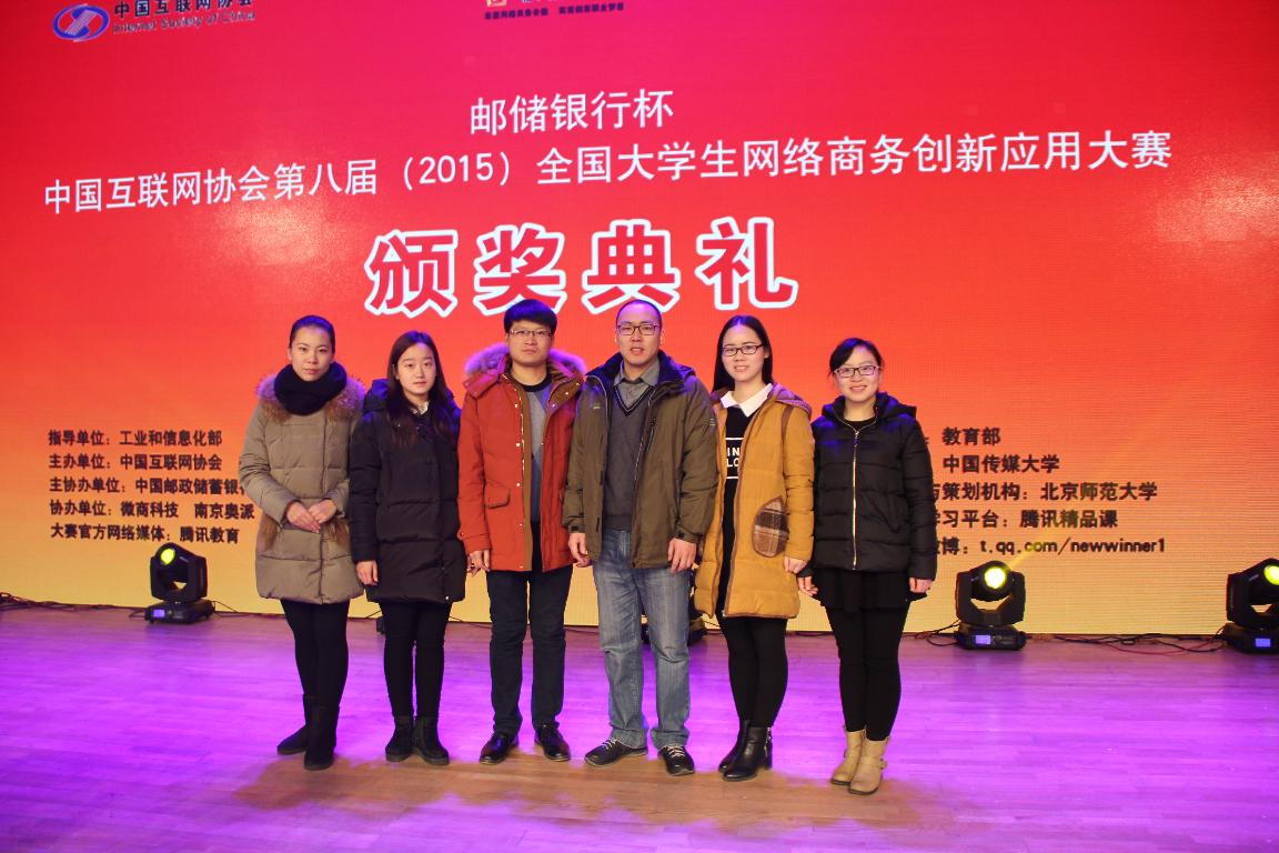 中国互联网协会“邮储银行杯”第八届全国大学生网络商务创新应用大赛全国总决赛于11月29日至30日在中国传媒大学举行。我校商学院陈培鸯、李丹、李肖依、王楠、赵笑笑五位同学组成的“挑战者”团队以华中赛区二等奖的优异成绩,直接晋级全国总决赛的角逐。该团队选择“在农村推广邮政银行电子银行”作为竞赛选题,经过现场答辩和评审,从进入全国总决赛的200余支本科队伍中脱颖而出,取得了“网络商务创新应用”全国总决赛三等奖的优异成绩,队员李肖依同学荣获校园大使优秀奖。