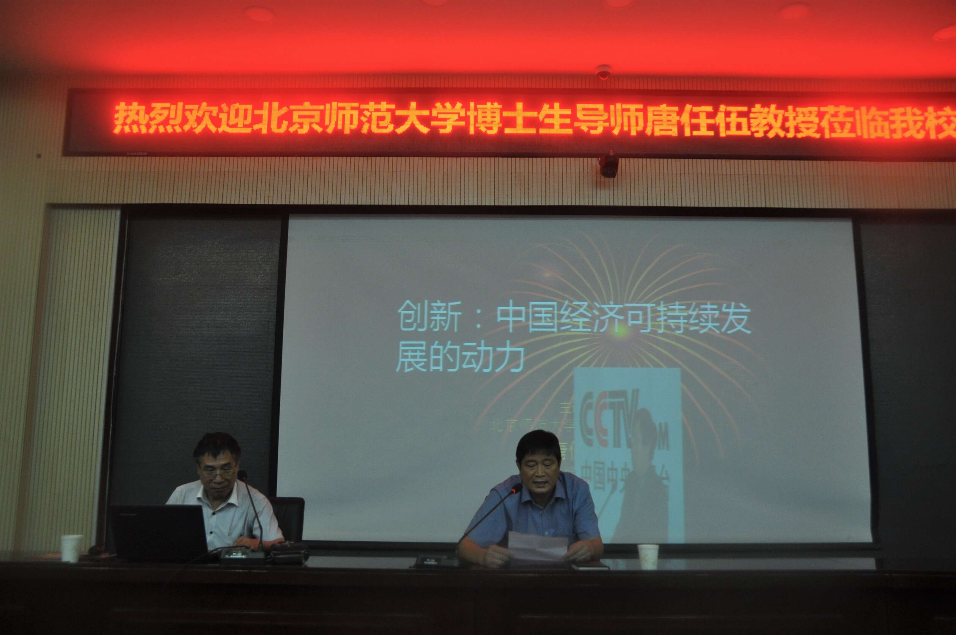 名师传道授业,创新保障发展。为使同学们深入了解我国当今经济发展形式、鼓励同学们创新发展、创造进取,9月20日上午10时,学院诚邀北京师范大学博士生导师唐任伍教授莅临我校马列平台,做了一场以“创新是国家可持续发展的保障”为题的报告,商学院青年教师及2016级学生认真聆听了报告,报告会由商学院党委书记李杰主持。